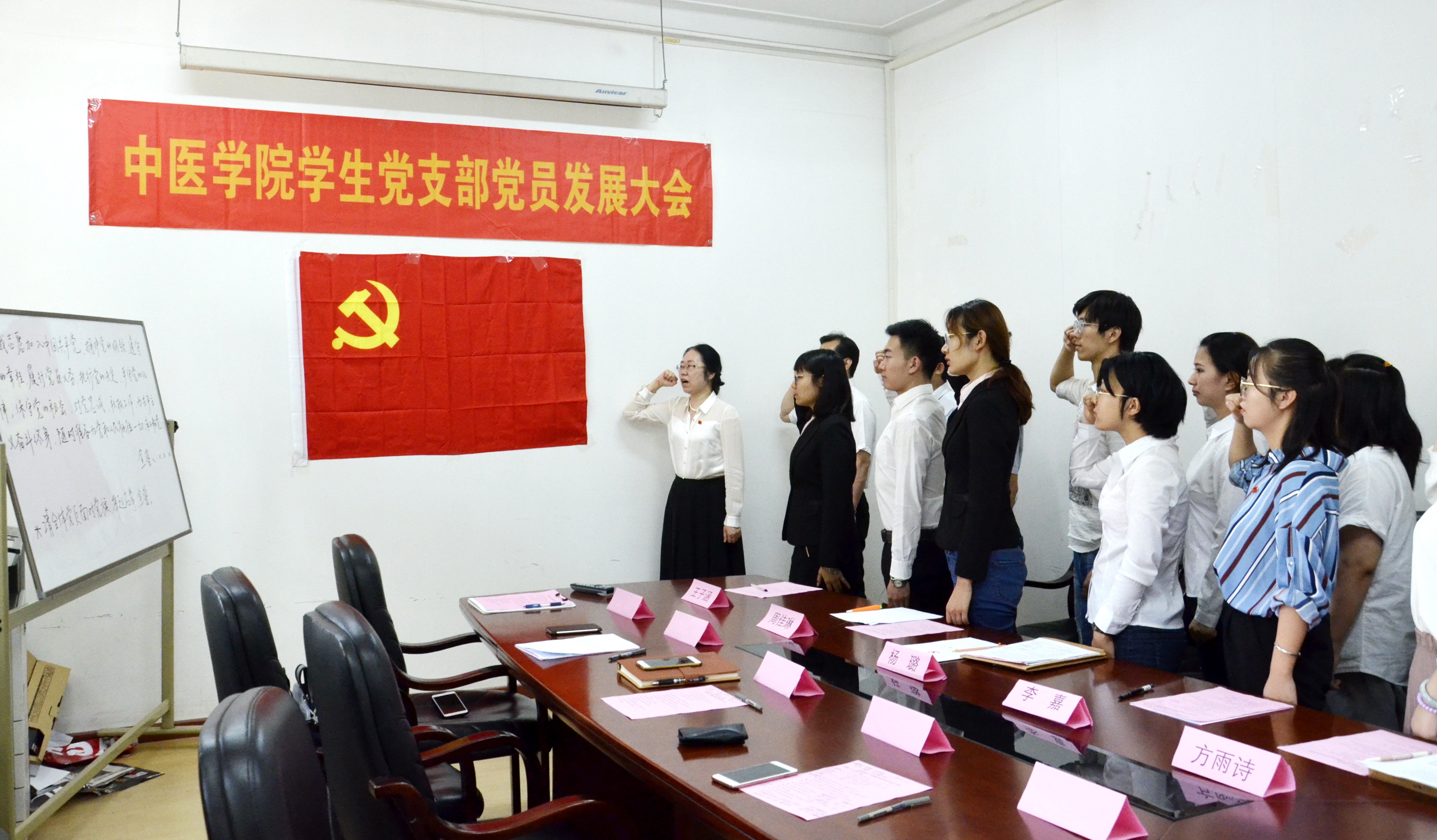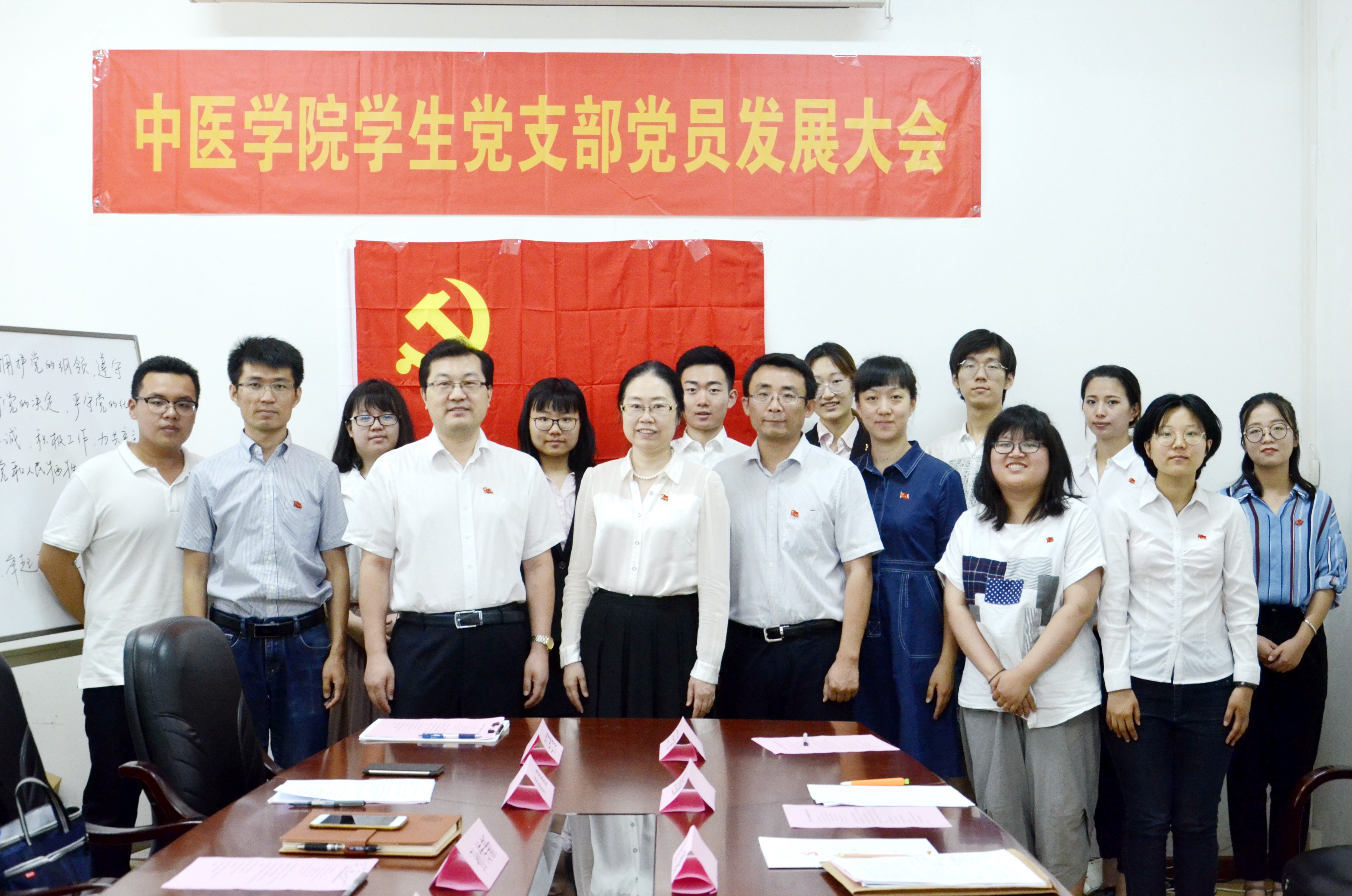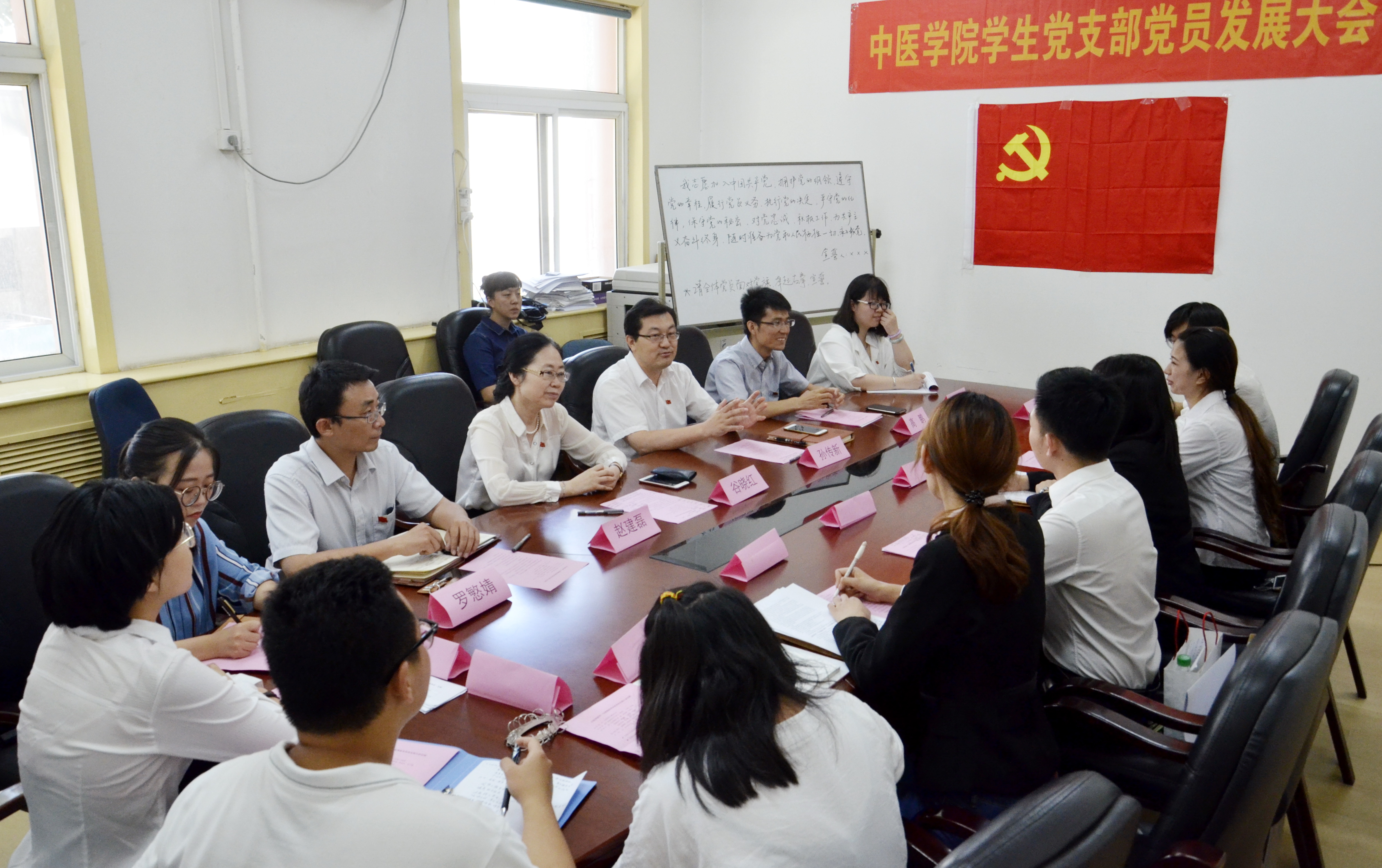 6月28日,在建党97周年来临之际,中医学院学生一支部召开全体党员大会,讨论了关于接收李嘉、方雨诗、杨璐三名同志为中共预备党员事宜。校党委书记谷晓红、中医学院党委书记孙传新、副书记赵建磊、学生党务工作者于欢出席会议,学生一支部10名党员和预备党员参加会议。会议由学生一支部书记高鹏主持。