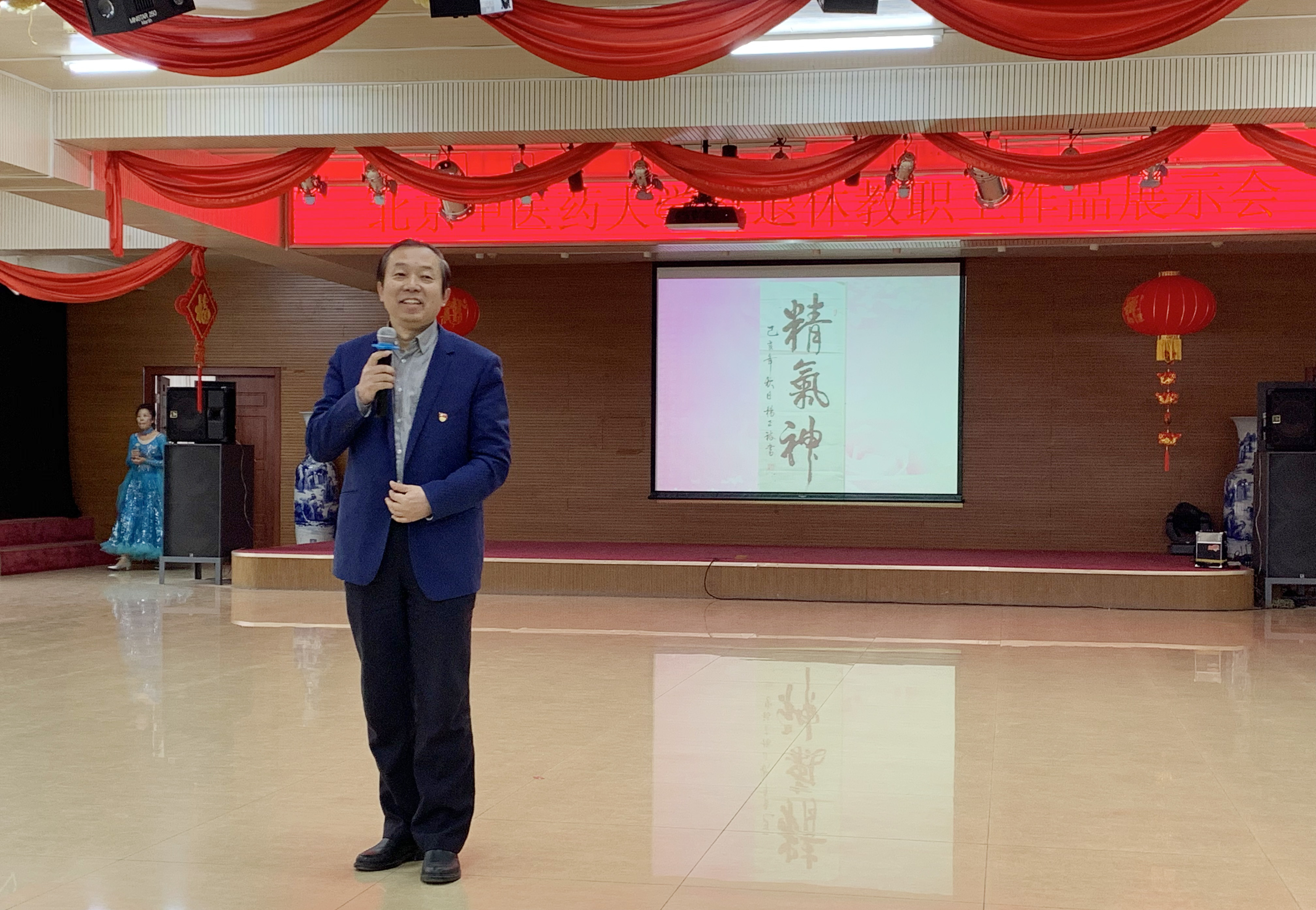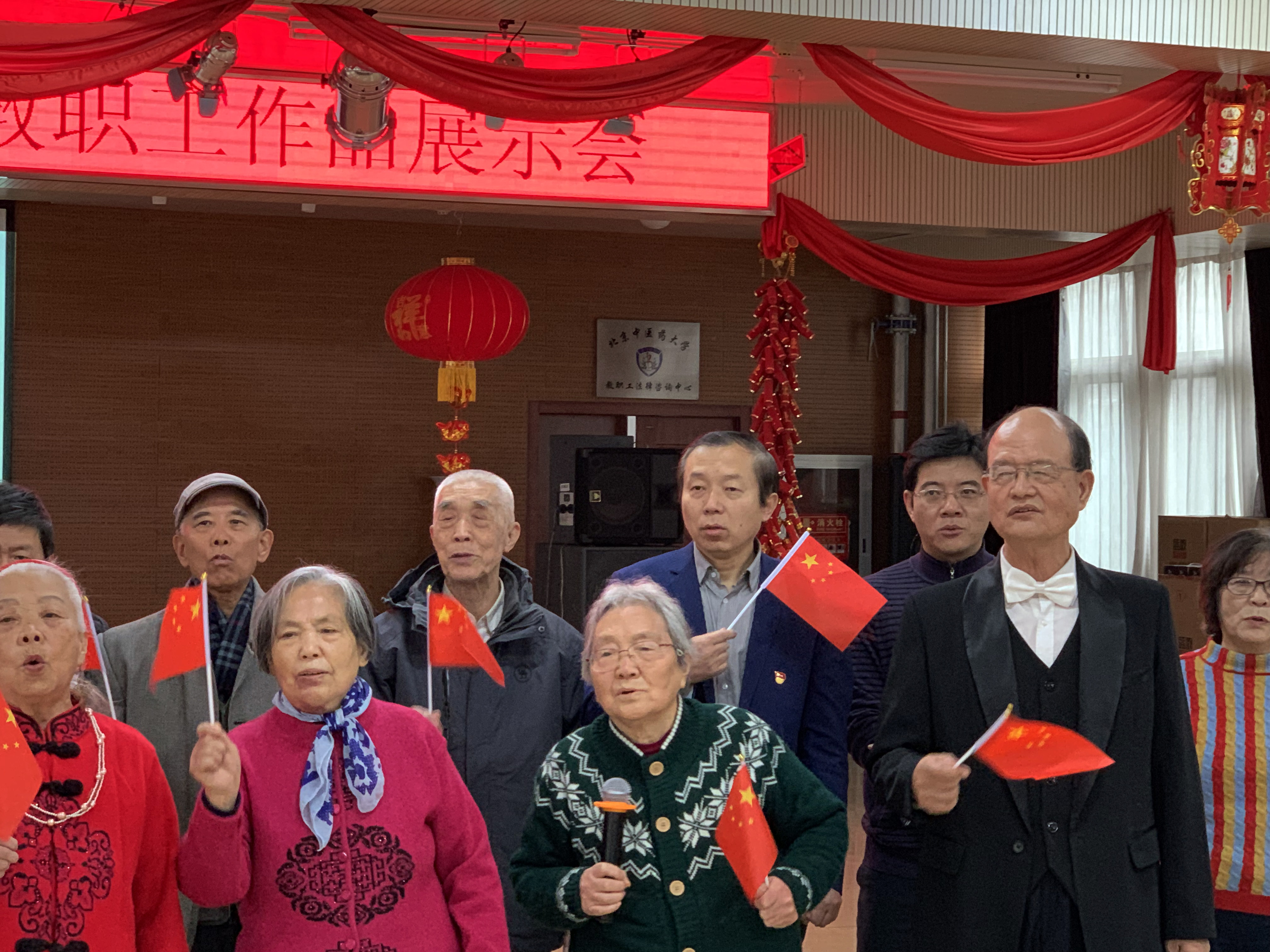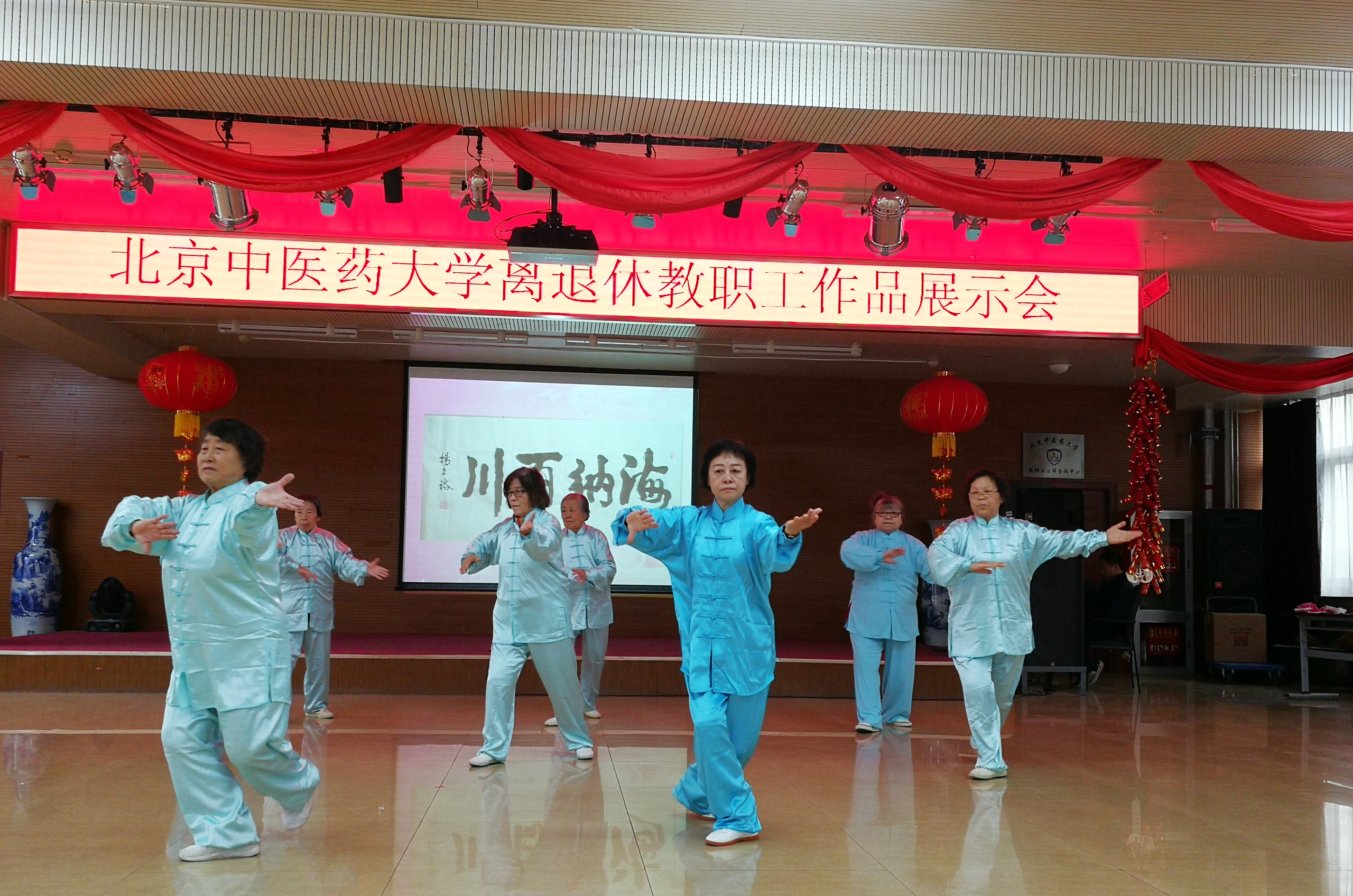 展示会紧扣主题,歌颂党、歌颂祖国、歌颂新时代新生活。在大屏幕滚动播放老同志金秋书画社、摄影小组作品的同时,老同志们进行了各文体活动成果展演。展演形式丰富多彩,有大合唱、女生小合唱、独唱、太极拳表演、民族舞表演、交谊舞表演等,展演节目中,《我和我的祖国》、《没有共产党就没有新中国》、《八部五法》、《葡萄园夜曲》、《多瑙河的黎明》、《在水一方》《金杯银杯》、《傣家小妹走过来》等既表达了老同志对伟大祖国的热爱,也表达了对新时代美好生活的眷恋,同时也反映了北中医老同志积极向上、乐观的生活态度,意气风发的精神面貌。