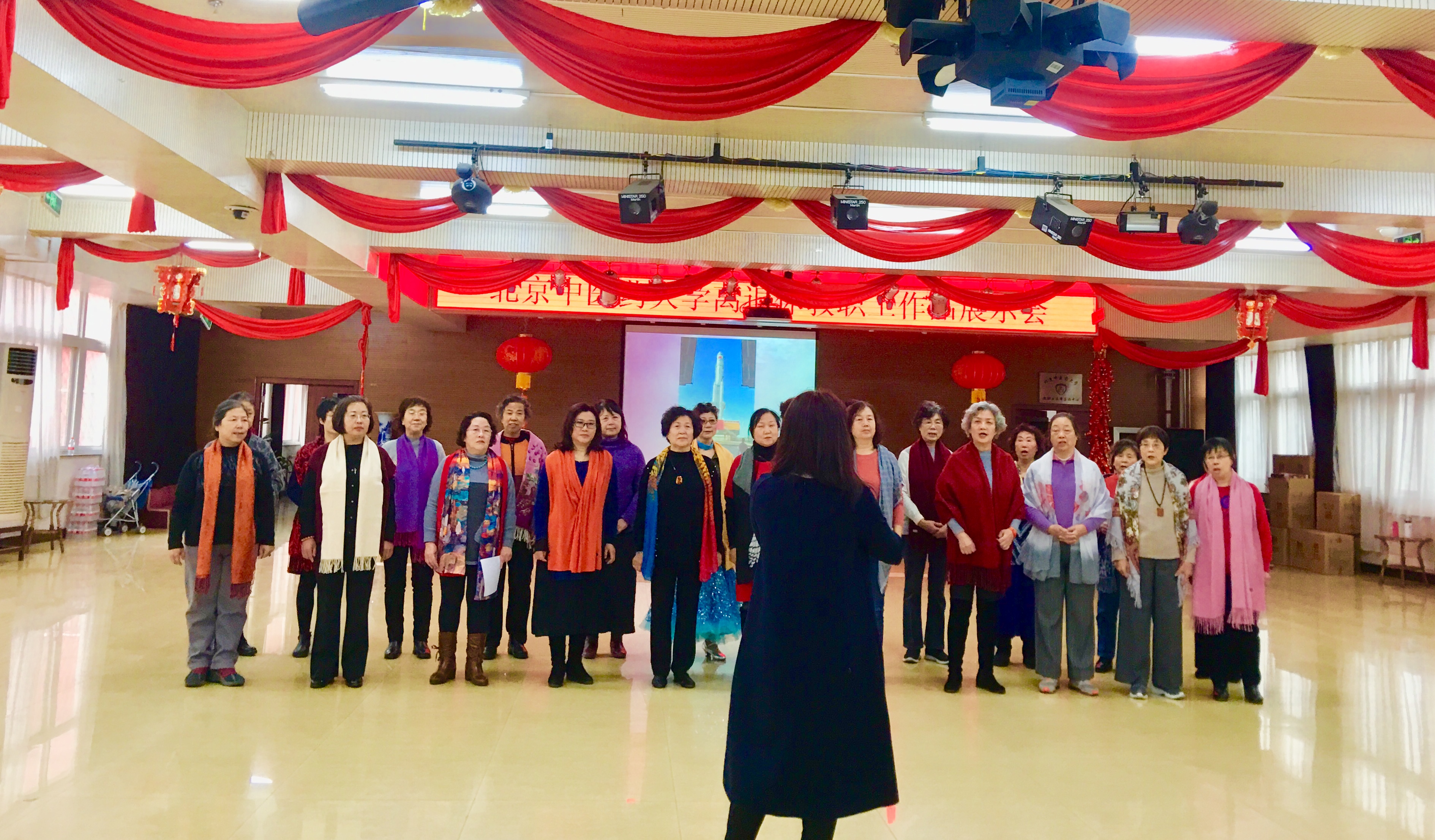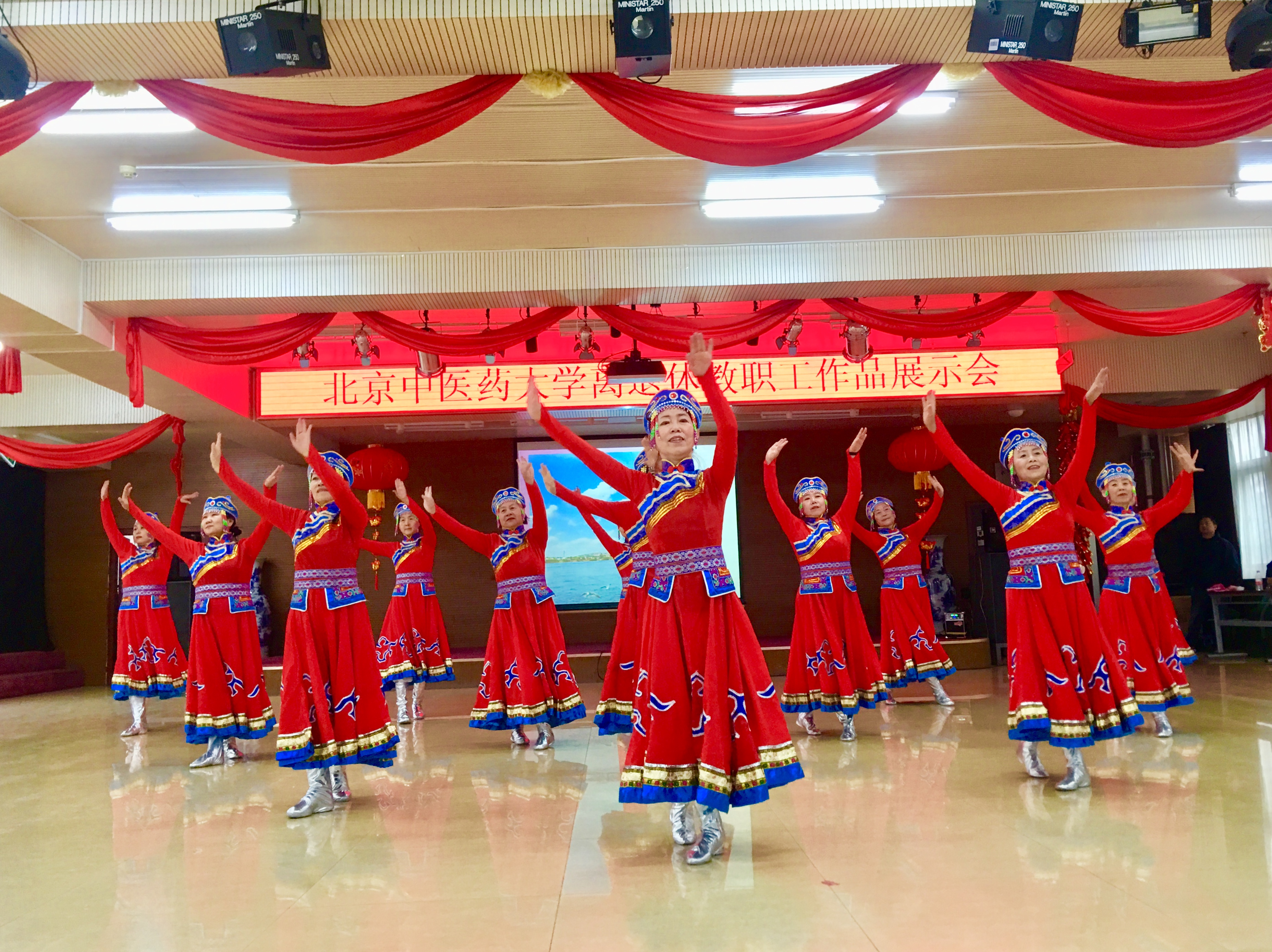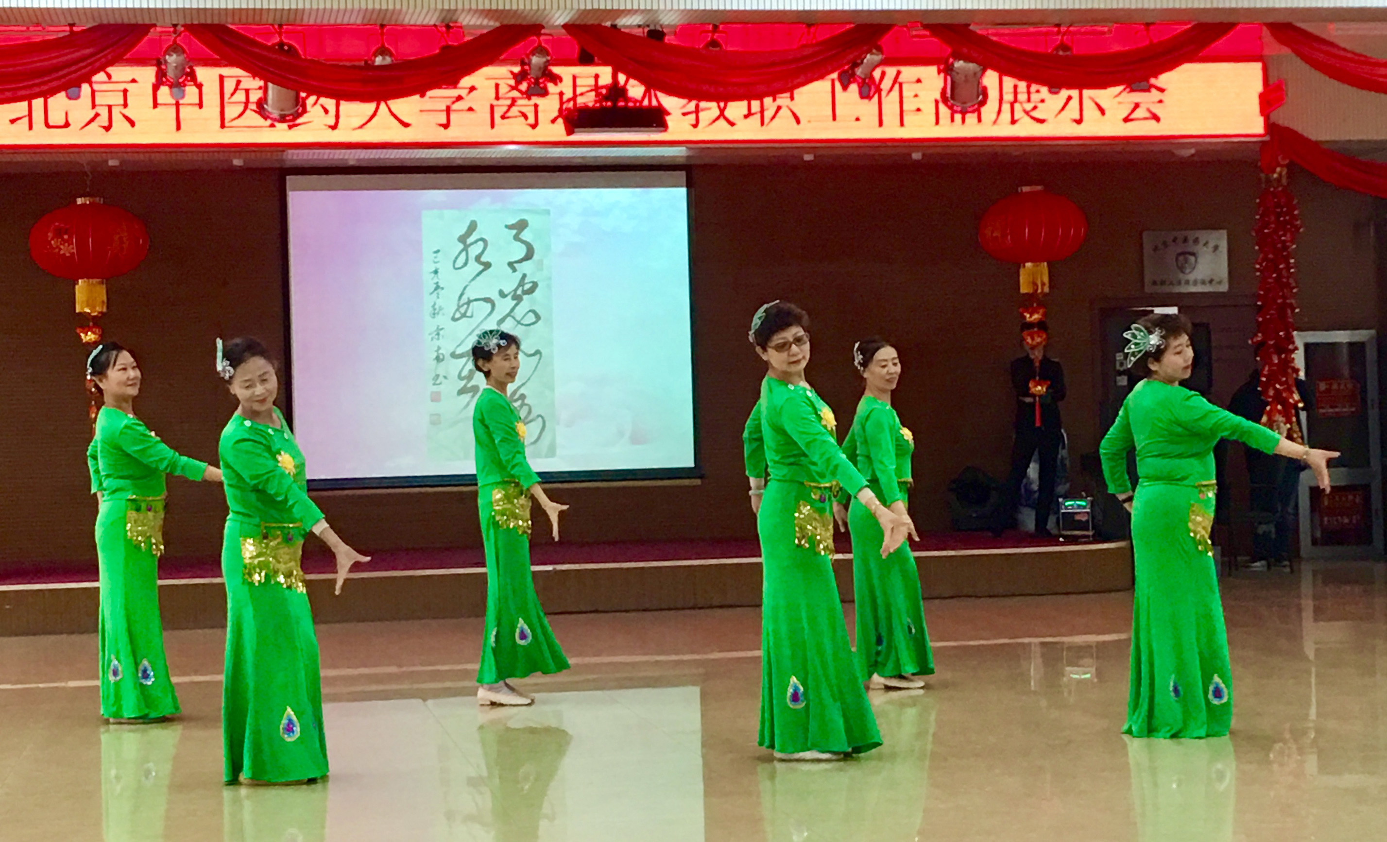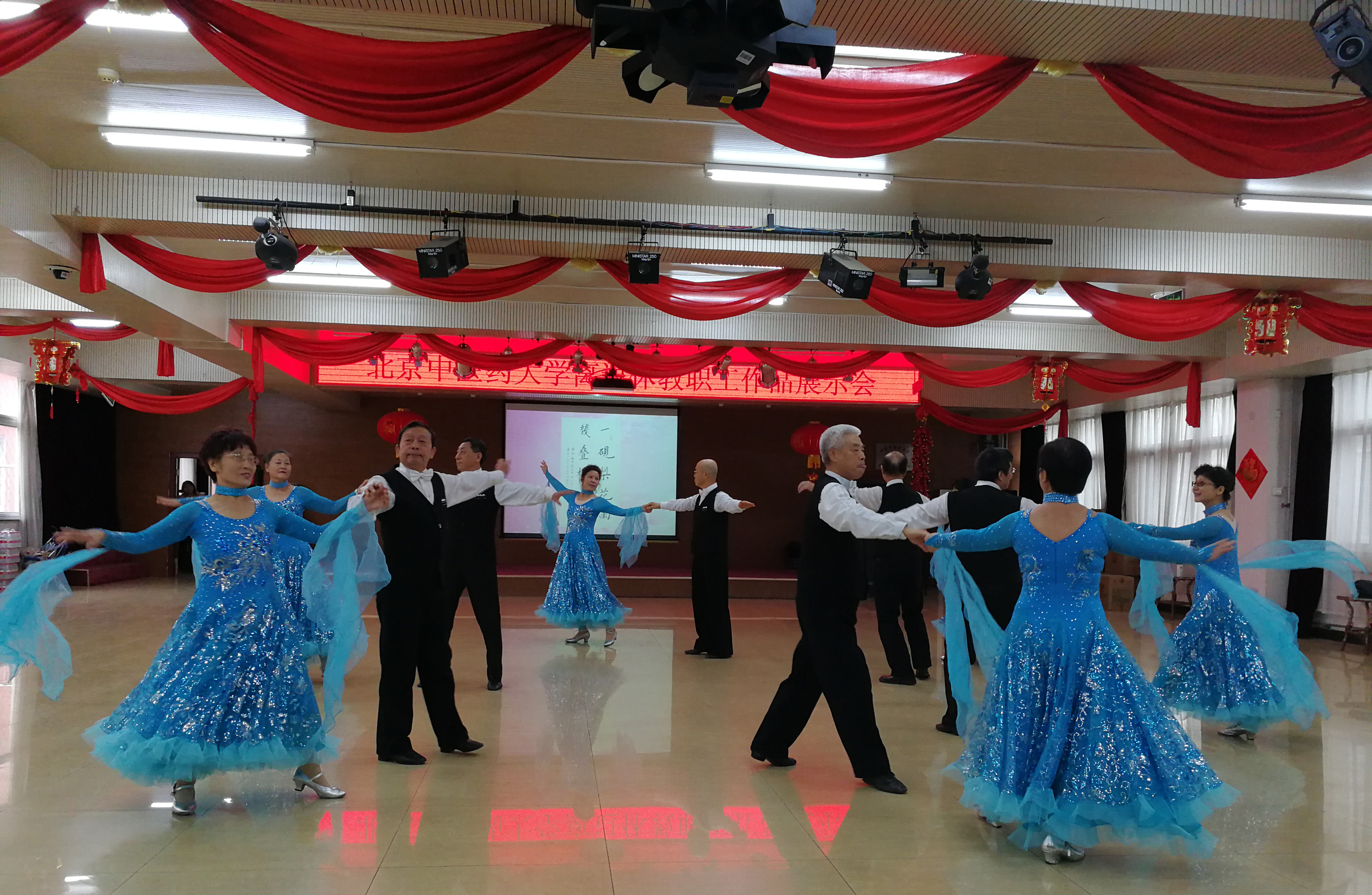 展示会紧扣主题,歌颂党、歌颂祖国、歌颂新时代新生活。在大屏幕滚动播放老同志金秋书画社、摄影小组作品的同时,老同志们进行了各文体活动成果展演。展演形式丰富多彩,有大合唱、女生小合唱、独唱、太极拳表演、民族舞表演、交谊舞表演等,展演节目中,《我和我的祖国》、《没有共产党就没有新中国》、《八部五法》、《葡萄园夜曲》、《多瑙河的黎明》、《在水一方》《金杯银杯》、《傣家小妹走过来》等既表达了老同志对伟大祖国的热爱,也表达了对新时代美好生活的眷恋,同时也反映了北中医老同志积极向上、乐观的生活态度,意气风发的精神面貌。