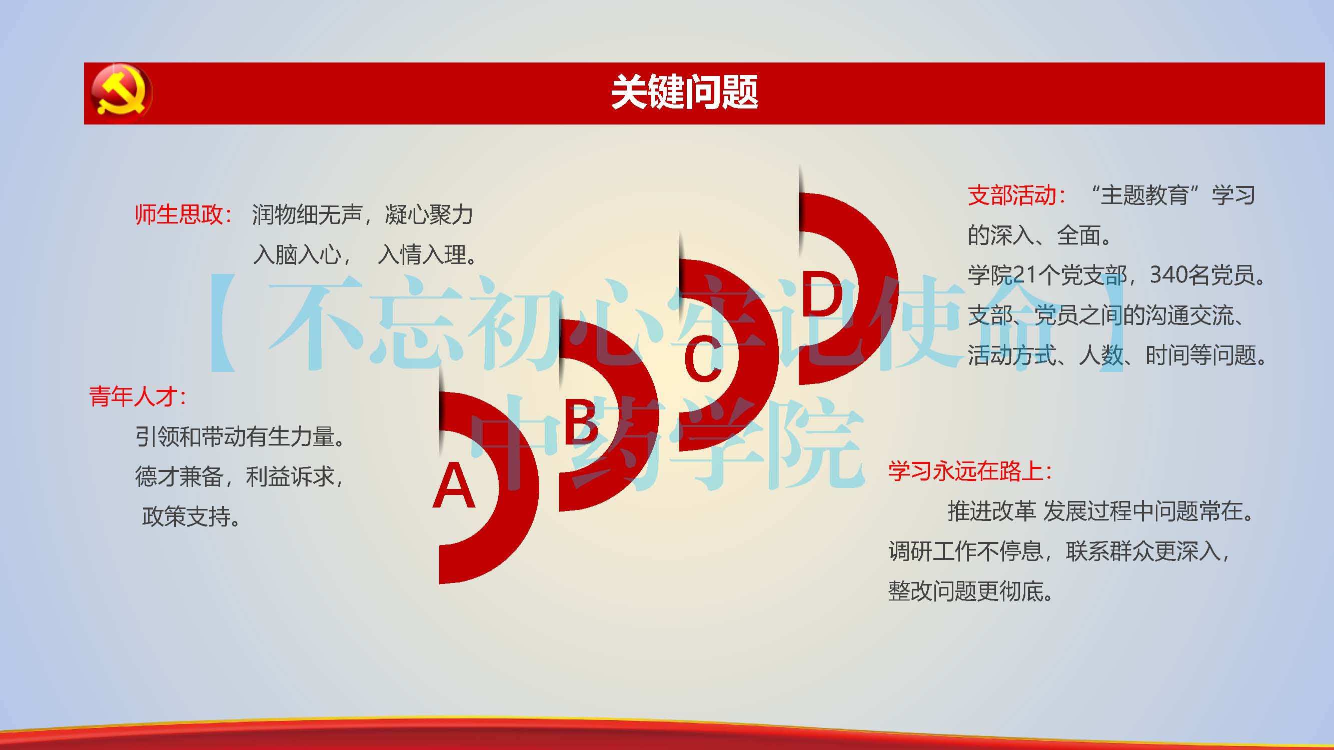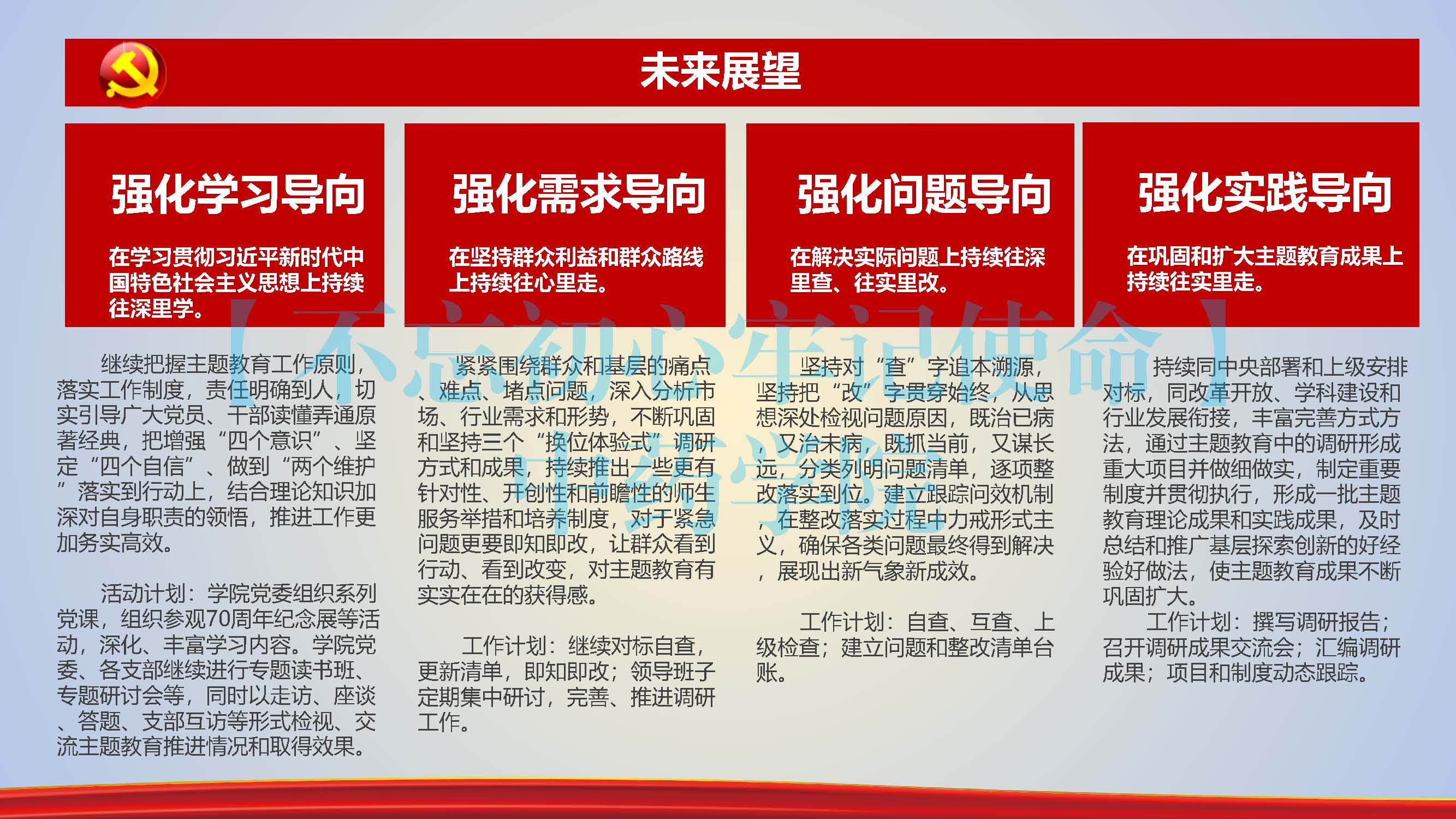 编者按:第二批“不忘初心、牢记使命”主题教育开展以来,我校各二级党组织坚持以习近平新时代中国特色社会主义思想滋养初心、引领使命,原原本本学习,结合实际学习,发挥优势学习,推动学习贯彻习近平新时代中国特色社会主义思想往深里走、往心里走、往实里走;突出分类指导,实现全员覆盖,加强统筹联动,提升整体质量,确保主题教育高标准高质量推进。各二级党组织以自我革命精神检视剖析问题,扎扎实实抓好整改落实,围绕加强党建找问题,聚焦党性修养挖根源,围绕办学育人中的重大问题抓整改,全面提高人才培养能力,加快改革发展步伐,在落实立德树人根本任务、服务经济社会发展、推进“双一流”建设上实现新突破。在此,我们将各二级学院开展主题教育的阶段工作报告分期刊出,供大家相互交流。