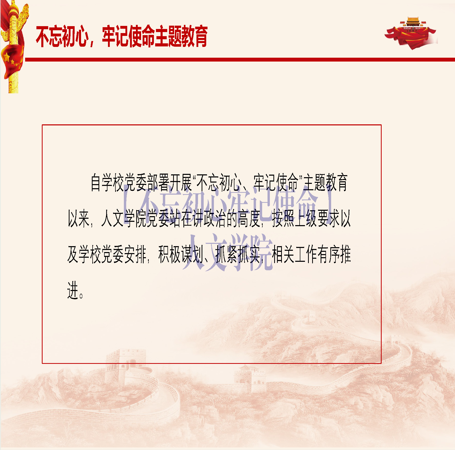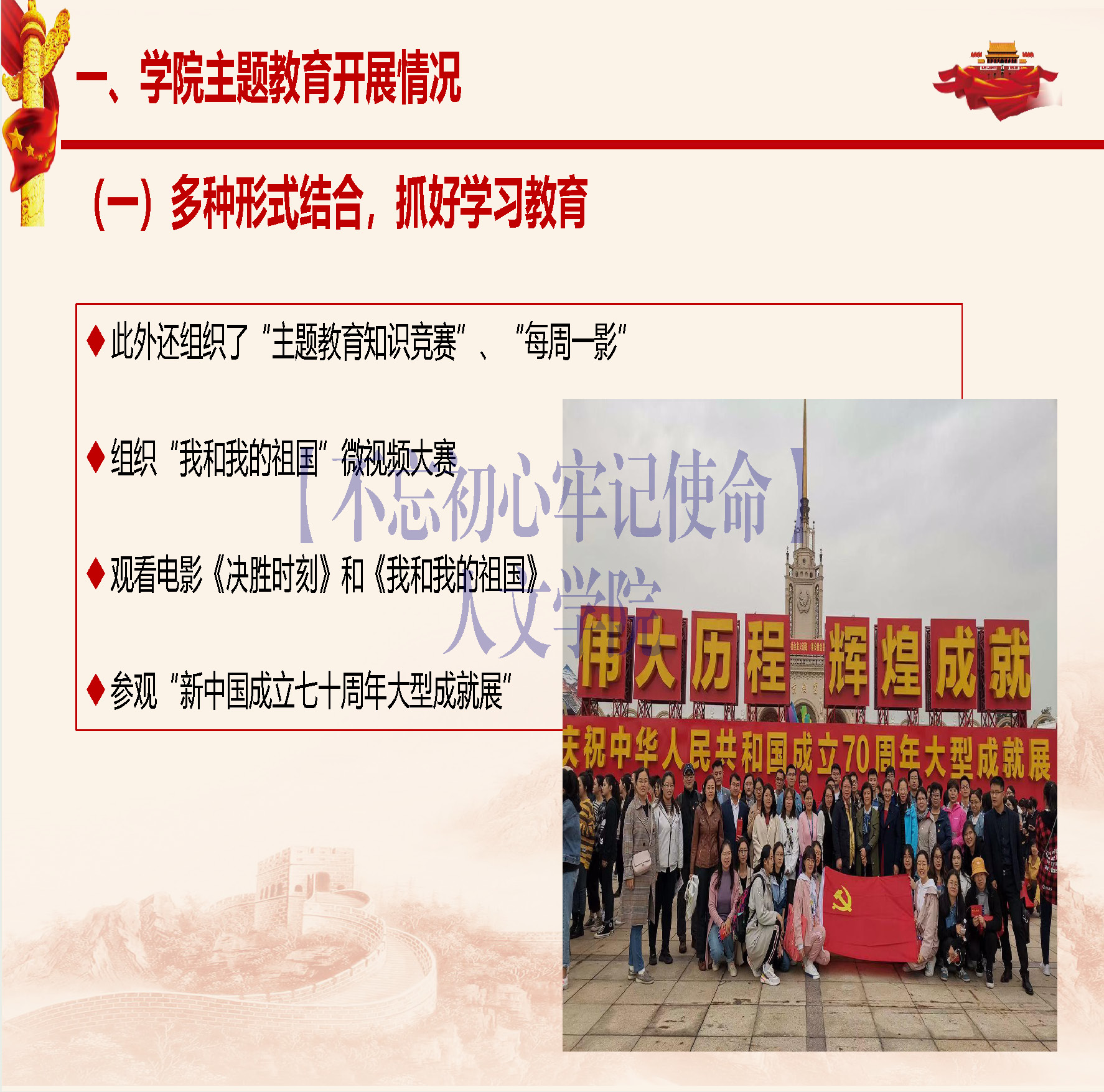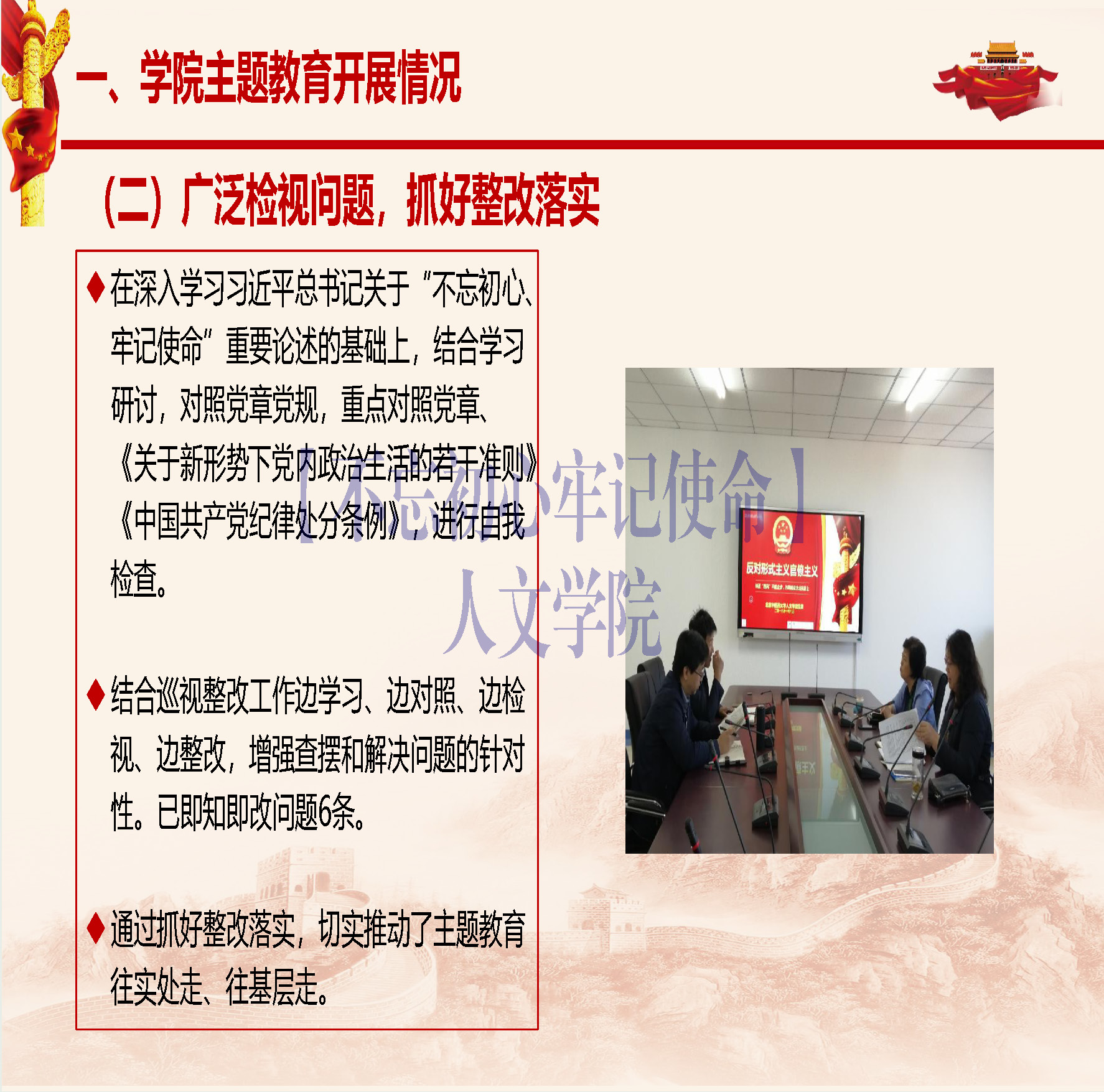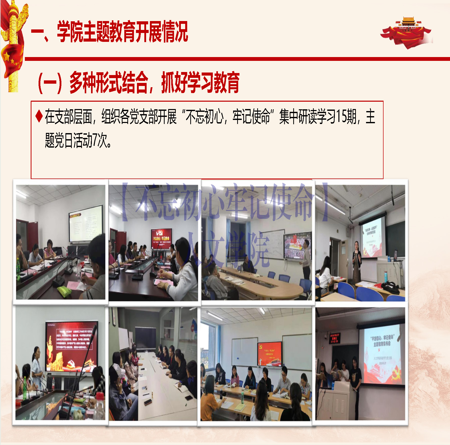 编者按:第二批“不忘初心、牢记使命”主题教育开展以来,我校各二级党组织坚持以习近平新时代中国特色社会主义思想滋养初心、引领使命,原原本本学习,结合实际学习,发挥优势学习,推动学习贯彻习近平新时代中国特色社会主义思想往深里走、往心里走、往实里走;突出分类指导,实现全员覆盖,加强统筹联动,提升整体质量,确保主题教育高标准高质量推进。各二级党组织以自我革命精神检视剖析问题,扎扎实实抓好整改落实,围绕加强党建找问题,聚焦党性修养挖根源,围绕办学育人中的重大问题抓整改,全面提高人才培养能力,加快改革发展步伐,在落实立德树人根本任务、服务经济社会发展、推进“双一流”建设上实现新突破。在此,我们将各二级学院开展主题教育的阶段工作报告分期刊出,供大家相互交流。
