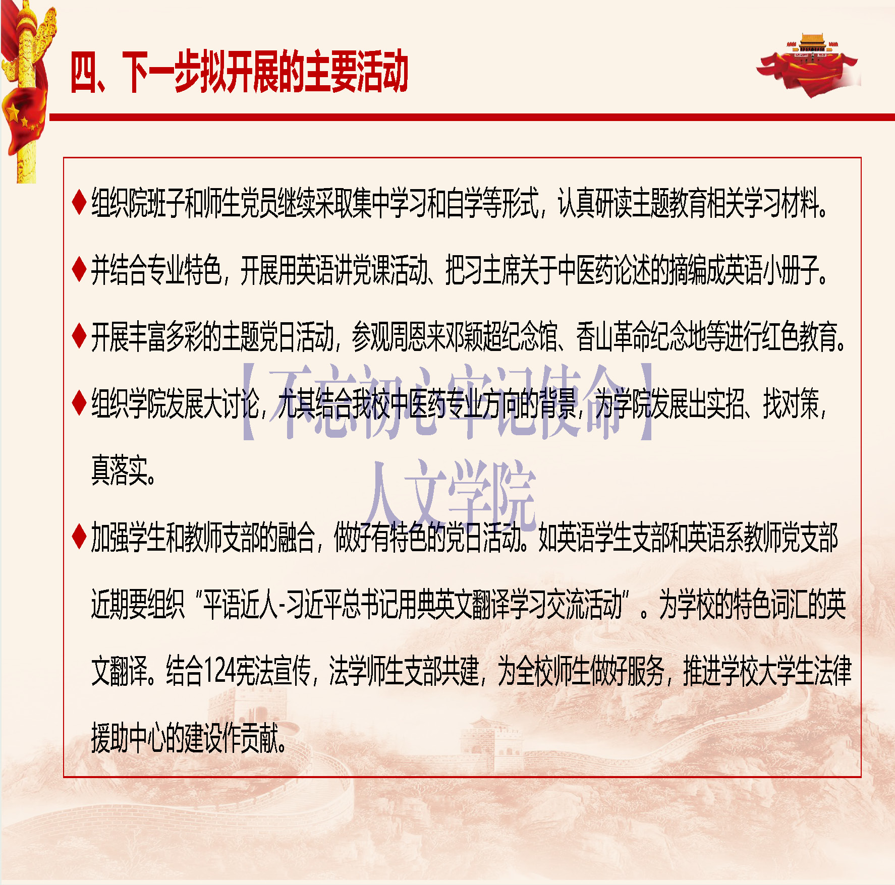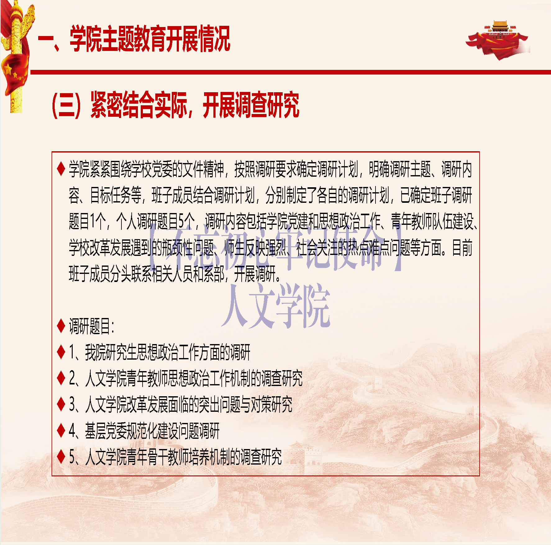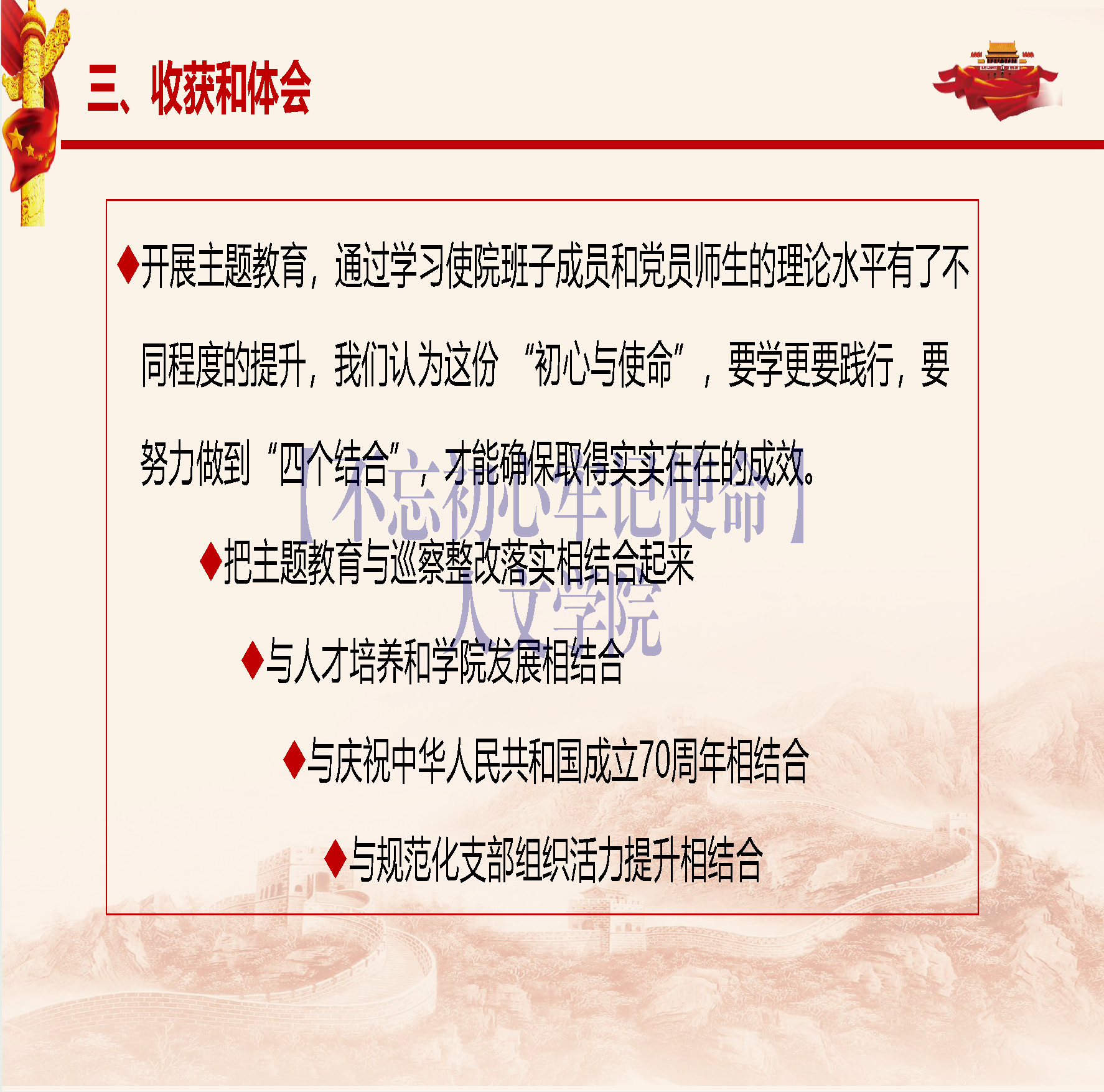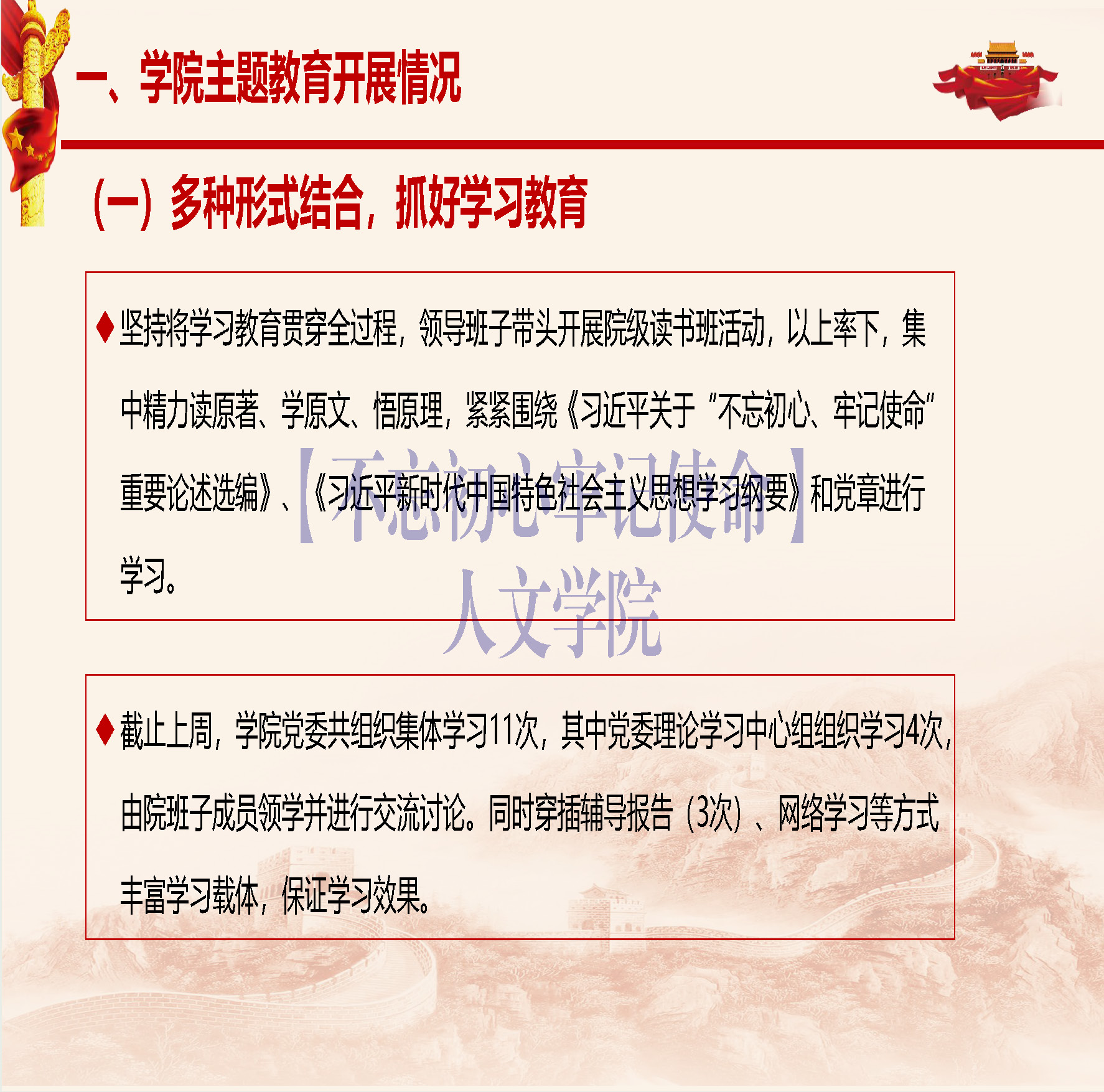 编者按:第二批“不忘初心、牢记使命”主题教育开展以来,我校各二级党组织坚持以习近平新时代中国特色社会主义思想滋养初心、引领使命,原原本本学习,结合实际学习,发挥优势学习,推动学习贯彻习近平新时代中国特色社会主义思想往深里走、往心里走、往实里走;突出分类指导,实现全员覆盖,加强统筹联动,提升整体质量,确保主题教育高标准高质量推进。各二级党组织以自我革命精神检视剖析问题,扎扎实实抓好整改落实,围绕加强党建找问题,聚焦党性修养挖根源,围绕办学育人中的重大问题抓整改,全面提高人才培养能力,加快改革发展步伐,在落实立德树人根本任务、服务经济社会发展、推进“双一流”建设上实现新突破。在此,我们将各二级学院开展主题教育的阶段工作报告分期刊出,供大家相互交流。