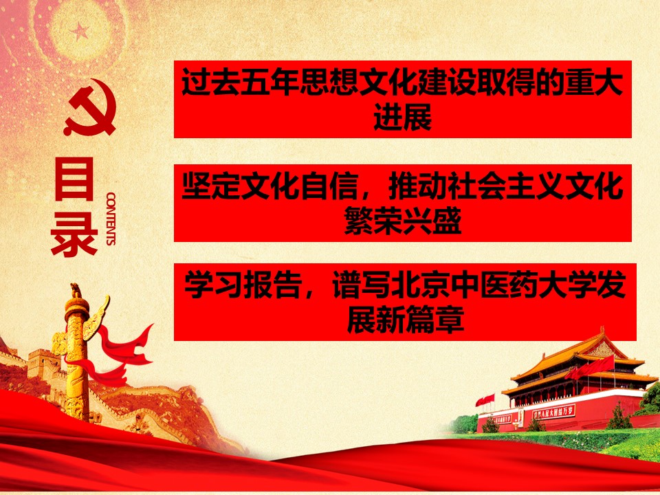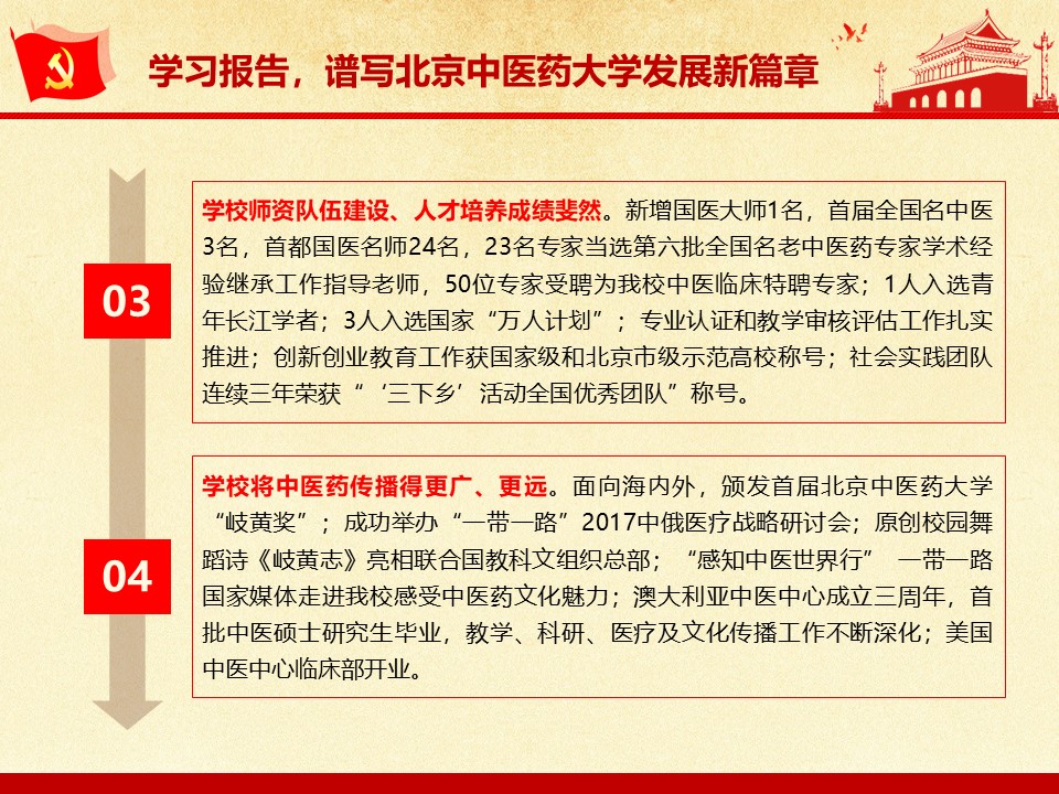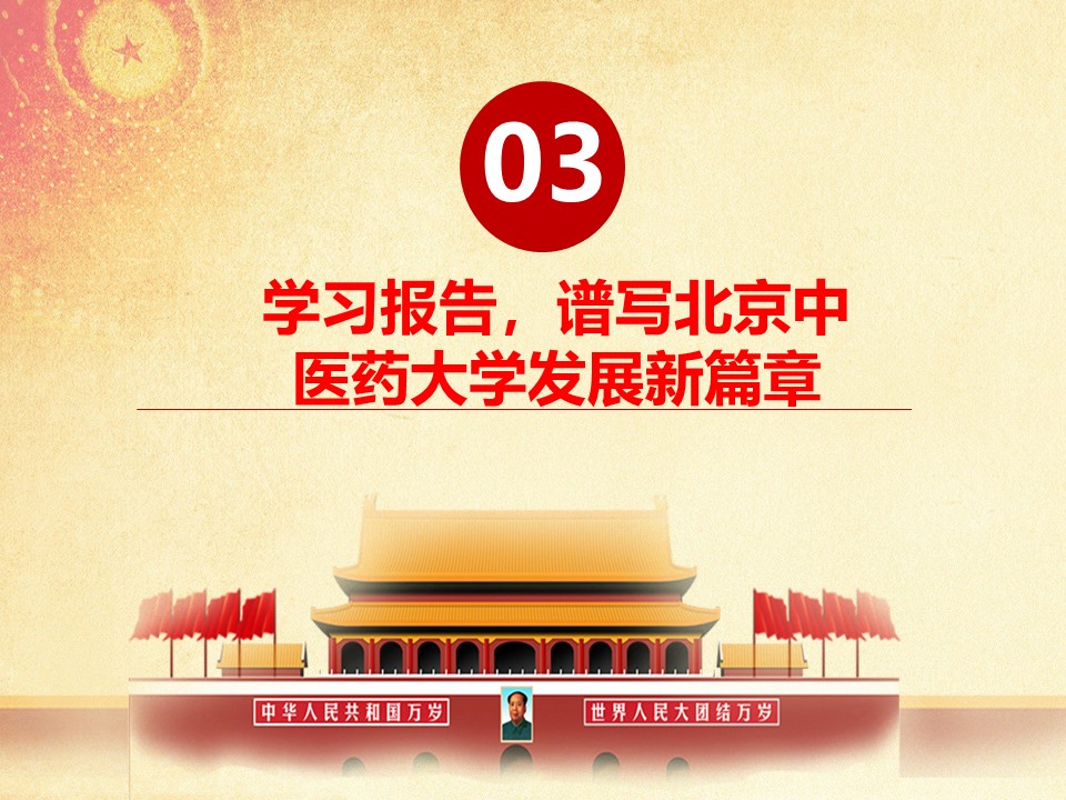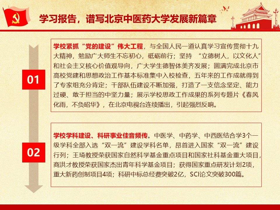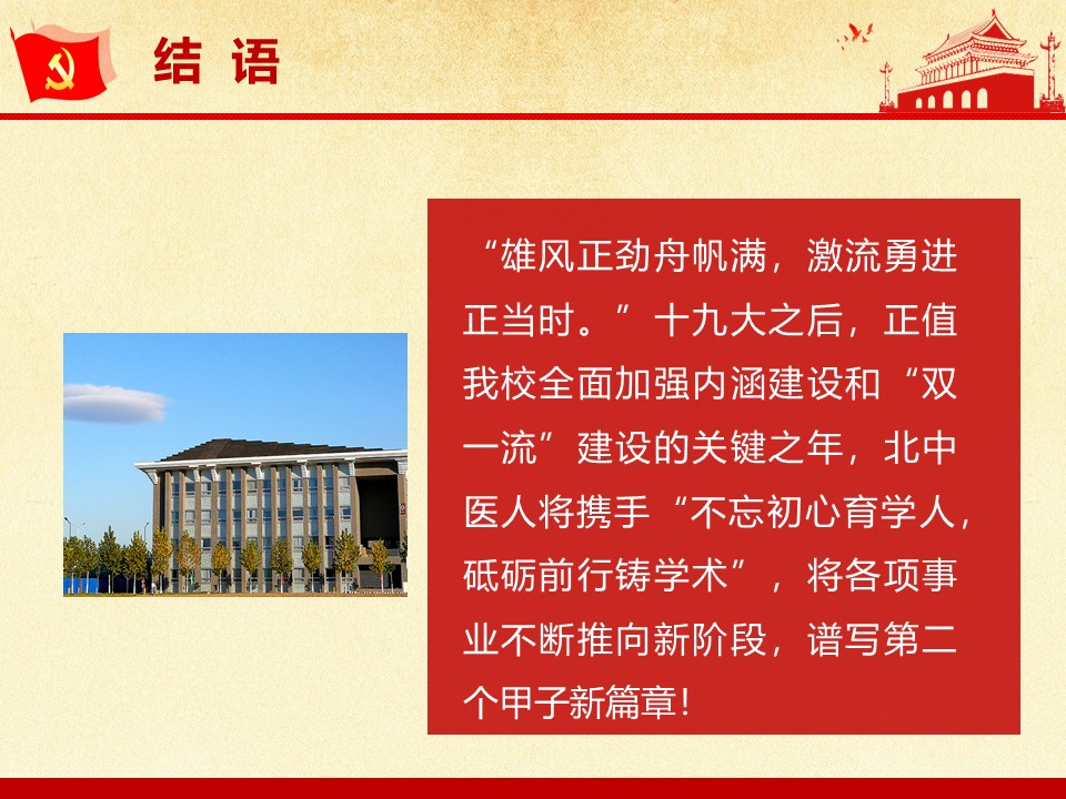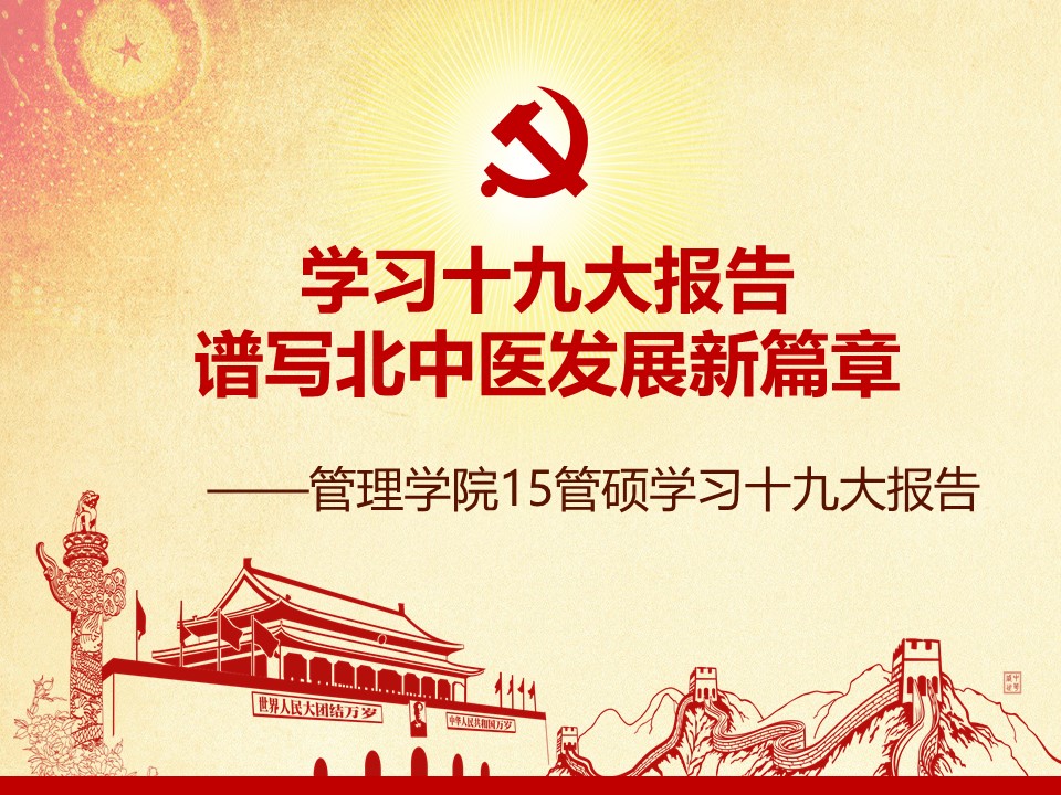 党的十九大胜利闭幕后,北京中医药大学各级党组织掀起了学习宣传贯彻党的十九大精神的热潮。学校党委组织部、党委宣传部和共青团组织共同举办了“认真学习宣传贯彻党的十九大精神,写好北中医奋进之笔——优秀党课课件评选与展播”活动。在此,我们遴选了一些内容比较丰富、设计比较精美的课件在此展出。