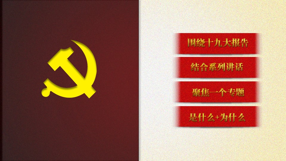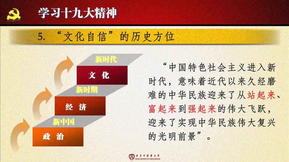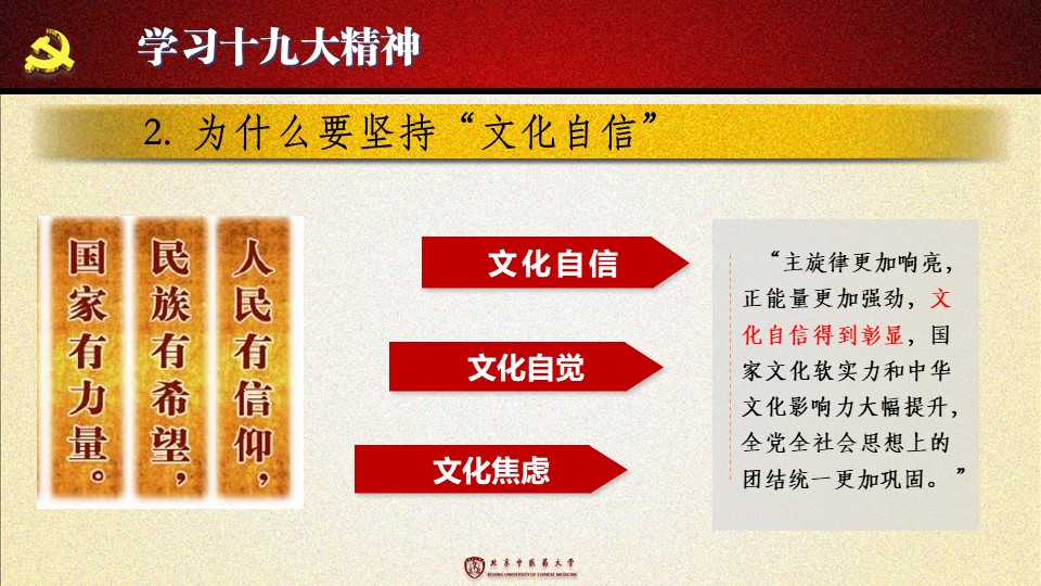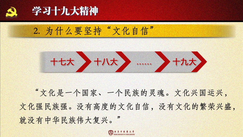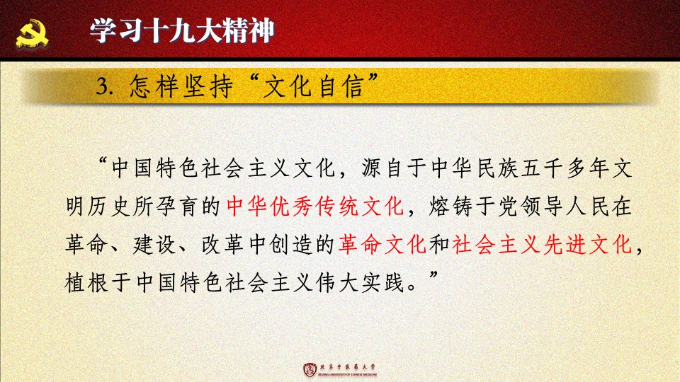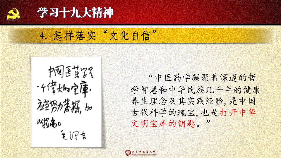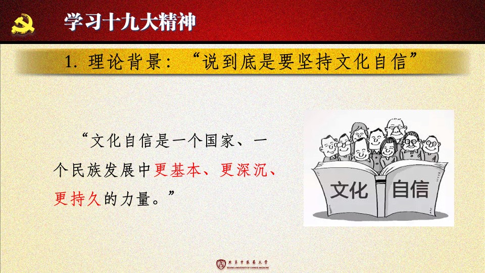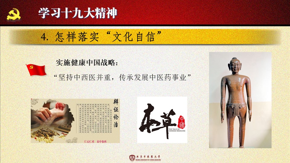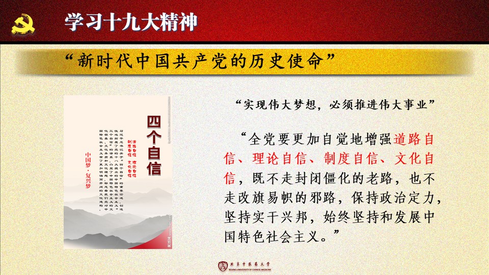 党的十九大胜利闭幕后,北京中医药大学各级党组织掀起了学习宣传贯彻党的十九大精神的热潮。学校党委组织部、党委宣传部和共青团组织共同举办了“认真学习宣传贯彻党的十九大精神,写好北中医奋进之笔——优秀党课课件评选与展播”活动。在此,我们遴选了一些内容比较丰富、设计比较精美的课件在此展出。