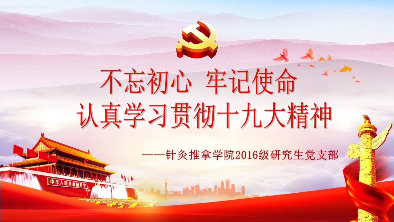 党的十九大胜利闭幕后,北京中医药大学各级党组织掀起了学习宣传贯彻党的十九大精神的热潮。学校党委组织部、党委宣传部和共青团组织共同举办了“认真学习宣传贯彻党的十九大精神,写好北中医奋进之笔——优秀党课课件评选与展播”活动。在此,我们遴选了一些内容比较丰富、设计比较精美的课件在此展出。